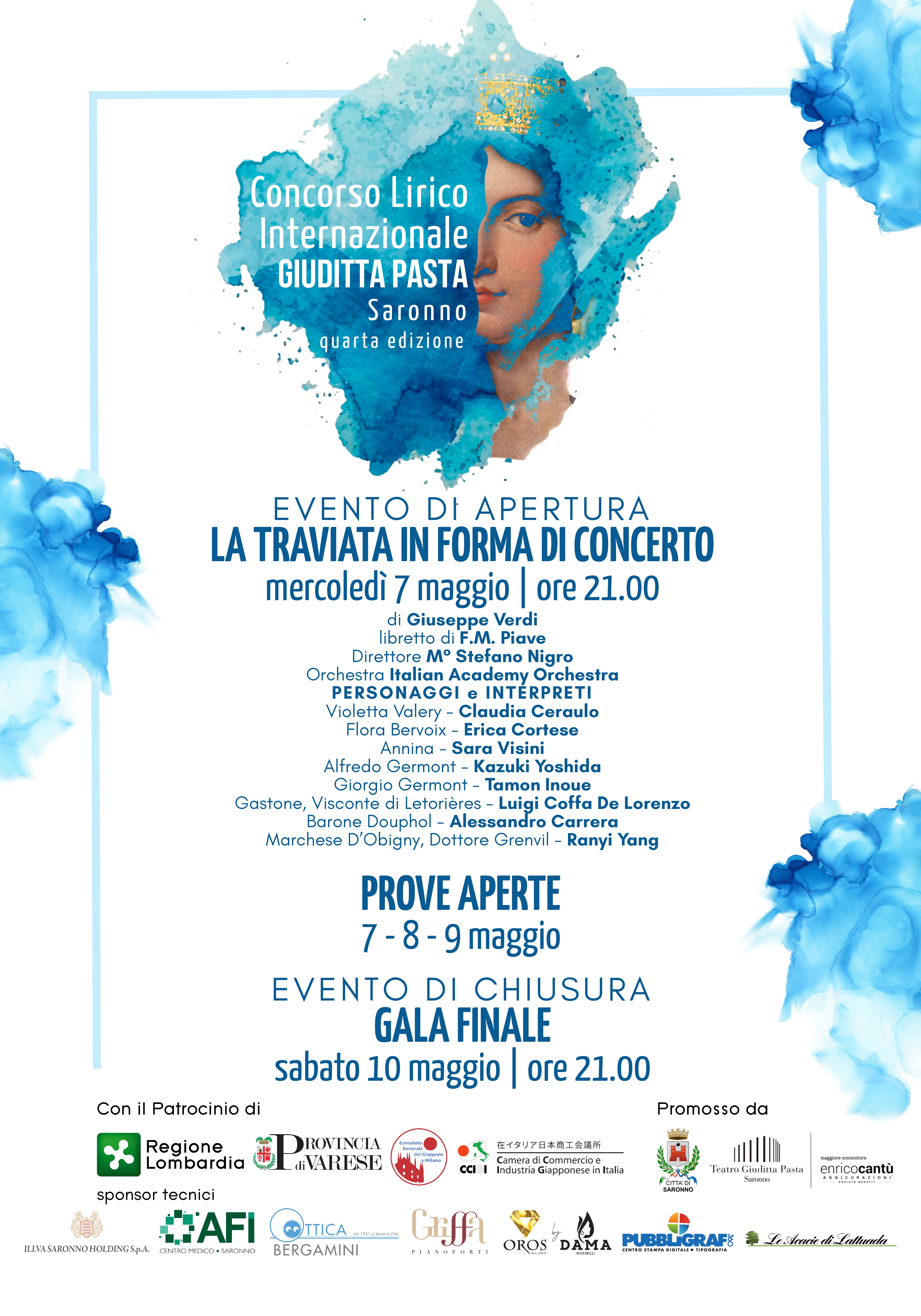 Per una settimana potranno lavorare intensamente, approfondire ed accrescere la propria esperienza professionale, sotto la guida del M° Stefano Nigro in qualità di Direttore e Maestro concertatore e avranno l’opportunità di partecipare alla Masterclass condotta da Andrea Chiodi, noto regista italiano e Direttore Artistico del Teatro Giuditta Pasta di Saronno. Questo evento di apertura della kermesse canora avrà luogo mercoledì 7 maggio alle ore 21.00 e l’opera Verdiana verrà eseguita in forma di concerto sul palcoscenico del Teatro Giuditta Pasta con la Italian Academy Orchestra. I biglietti per l’evento sono acquistabili su sito del Teatro Giuditta Pasta. La Giuria del concorso sarà di fama internazionale e selezionerà i migliori cantanti attraverso una prova eliminatoria e una semifinale.