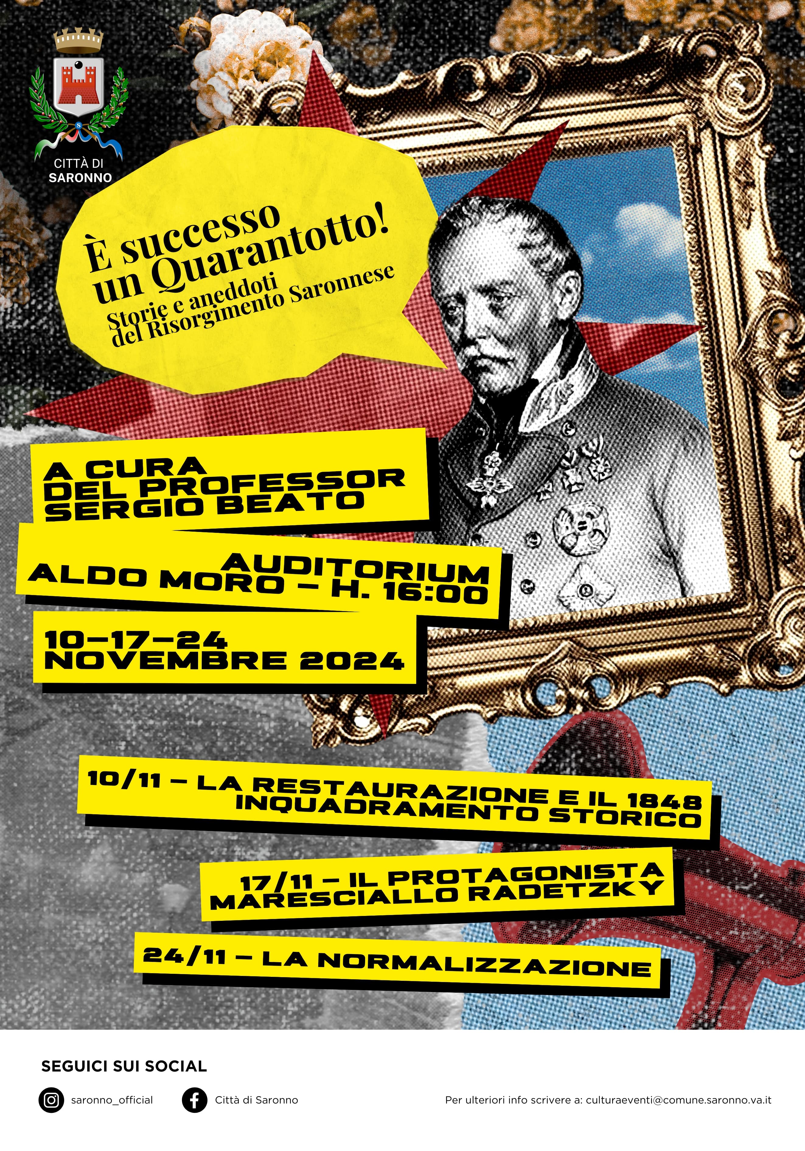 L'Amministrazione Comunale propone un ciclo di conferenze condotte dal Prof. Sergio Beato sul tema del Risorgimento saronnese, attraverso storie, aneddoti, presentazioni multimediali e documenti d’archivio.