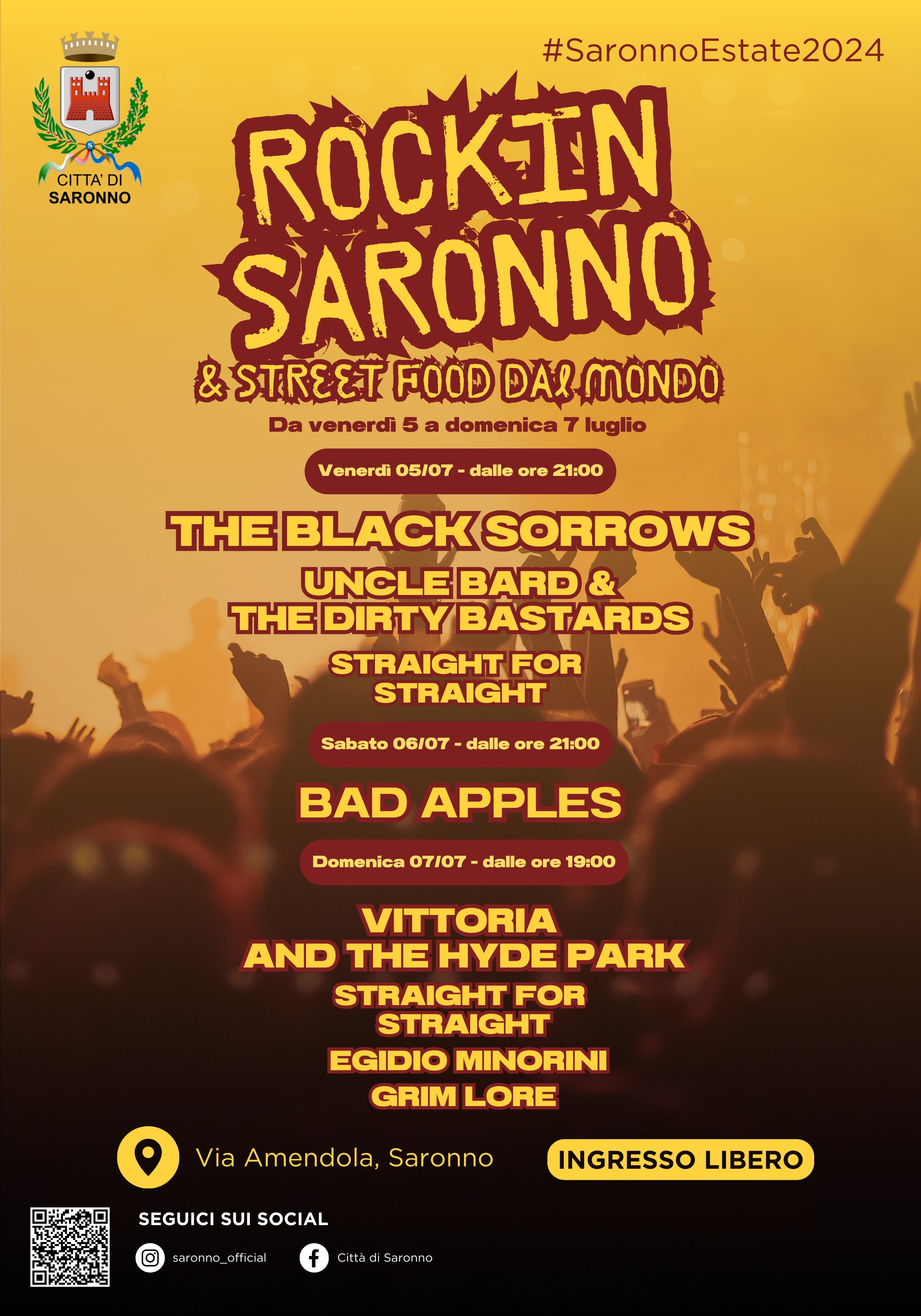 Sabato 6 luglio sul palco sono invece attesi i Bad Apples, alle ore 21. Una rock band italiana, nata nel 2017 e composta da 4 elementi. Il loro spirito è rock, hard rock e heavy metal. Ragazzi di età diverse, ma con un’unica passione: la musica. nel 2019 esce il loro album Bad Apples che, nei suoi 8 singoli, racchiude tutta l’energia, la passione, la dedizione e la tecnica della band. Attualmente i componenti sono: Marco Landro (voce e chitarra), Mario Paparone (chitarra e cori), Stefano Gualtieri (batteria) e dal 2024, a seguito di un cambio formazione, Giorgia Perrone (basso). La band è conosciuta per il suo sound grazie a esibizioni sul territorio della Provincia di Varese e Milano.