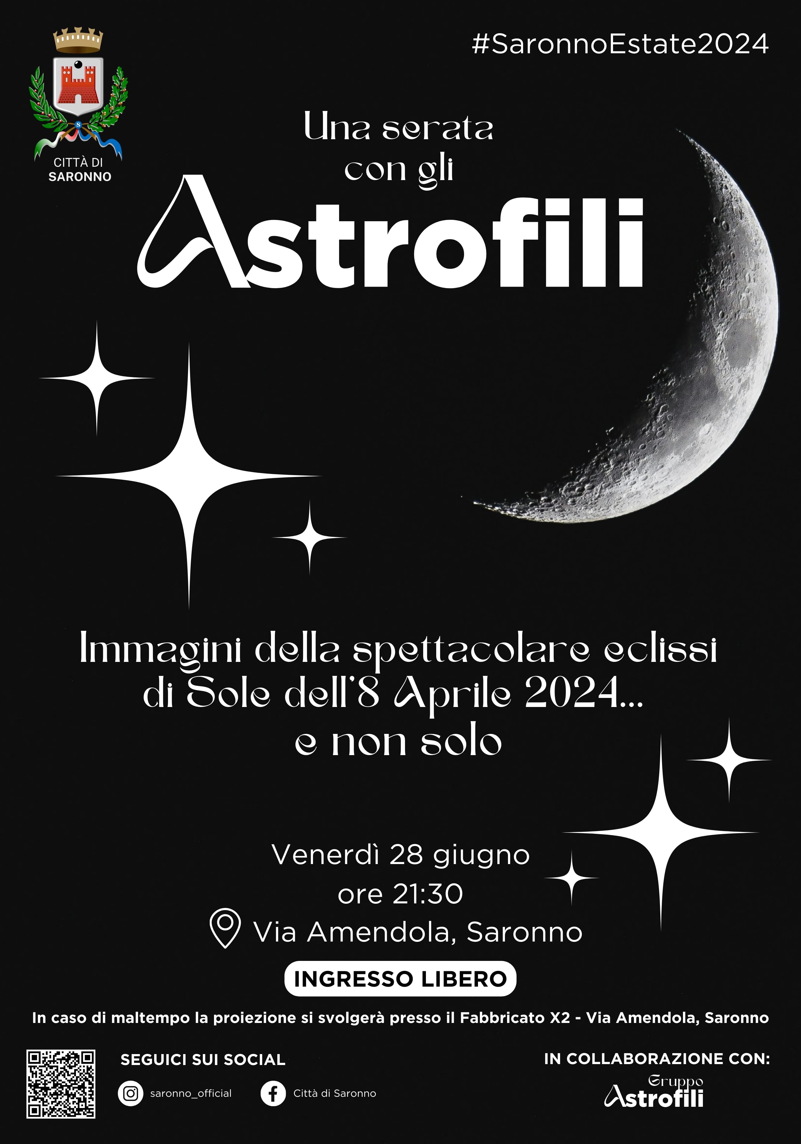 Il Comune di Saronno e il Gruppo Astrofili di Saronno propongono una serata di proiezioni fotografiche della spettacolare eclissi di Sole del 8 Aprile 2024... e non solo. Le immagini saranno presentate