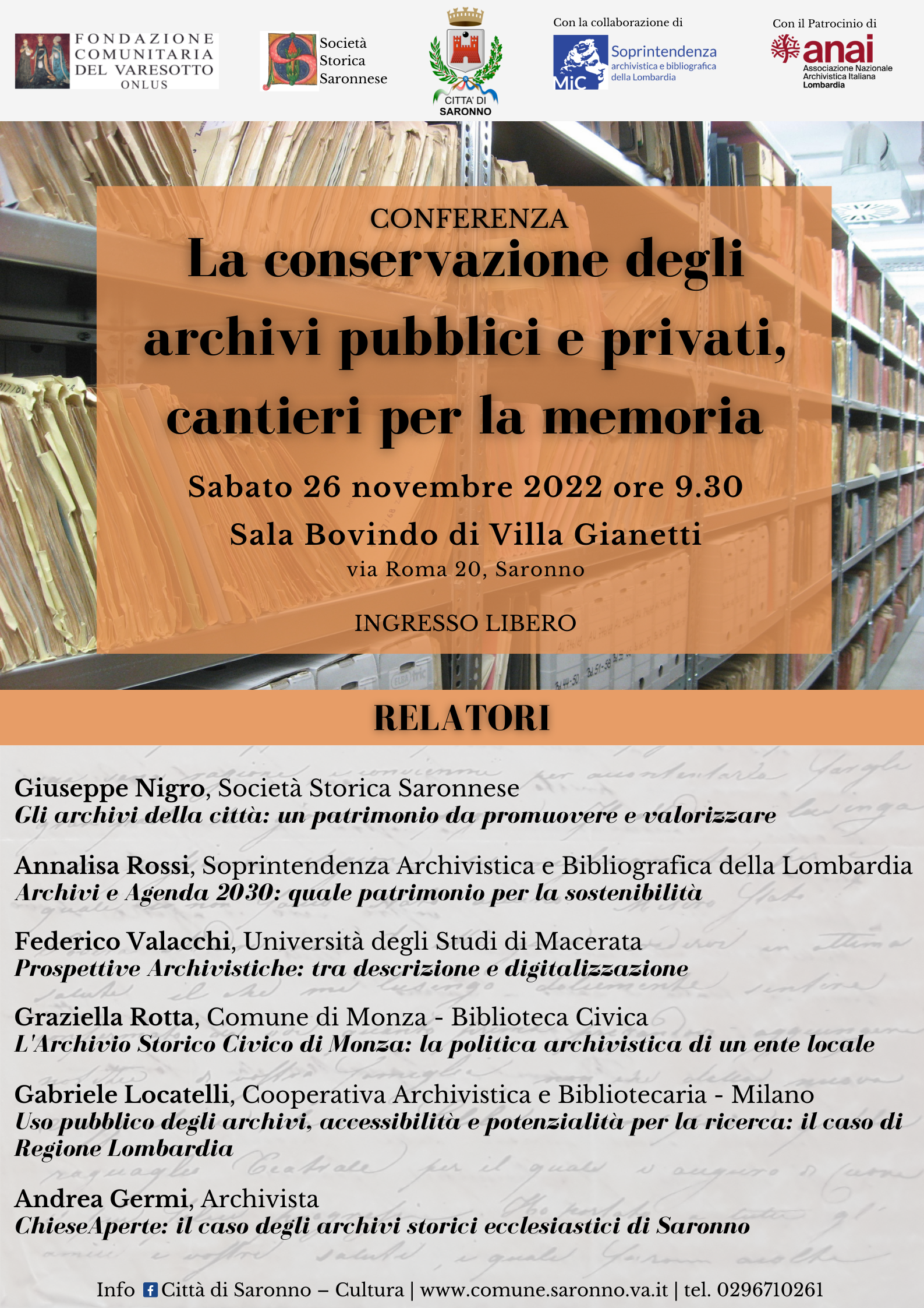 nov 25 2022 La Conservazione degli archivi pubblici e privati Presso Villa Gianetti da venerdì 25 novembre 2022 - a sabato 26 novembre 2022